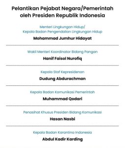 Para pejabat yang dilantik meliputi Menteri Lingkungan Hidup/Kepala Badan Pengendalian Lingkungan Hidup, Mohammad Jumhur Hidayat, Wakil Menteri Koordinator Bidang Pangan, Hanif Faisal Nurofik, Kepala Staf Kepresidenan, Dudung Abdurachman, Kepala Badan Komunikasi Pemerintah, Mohammad Qodari, Kepala Badan Karantina Indonesia, Abdul Kadir Karding, serta Penasihat Khusus Presiden Bidang Komunikasi, Hasan Nasbi.